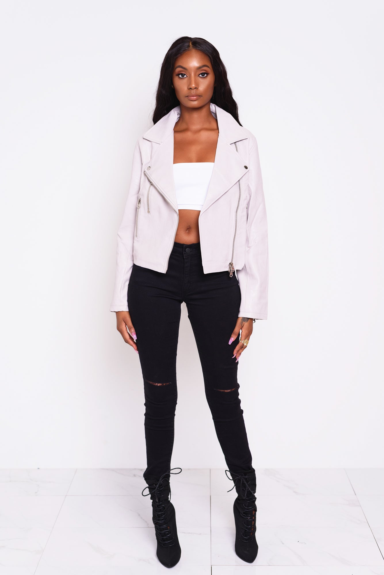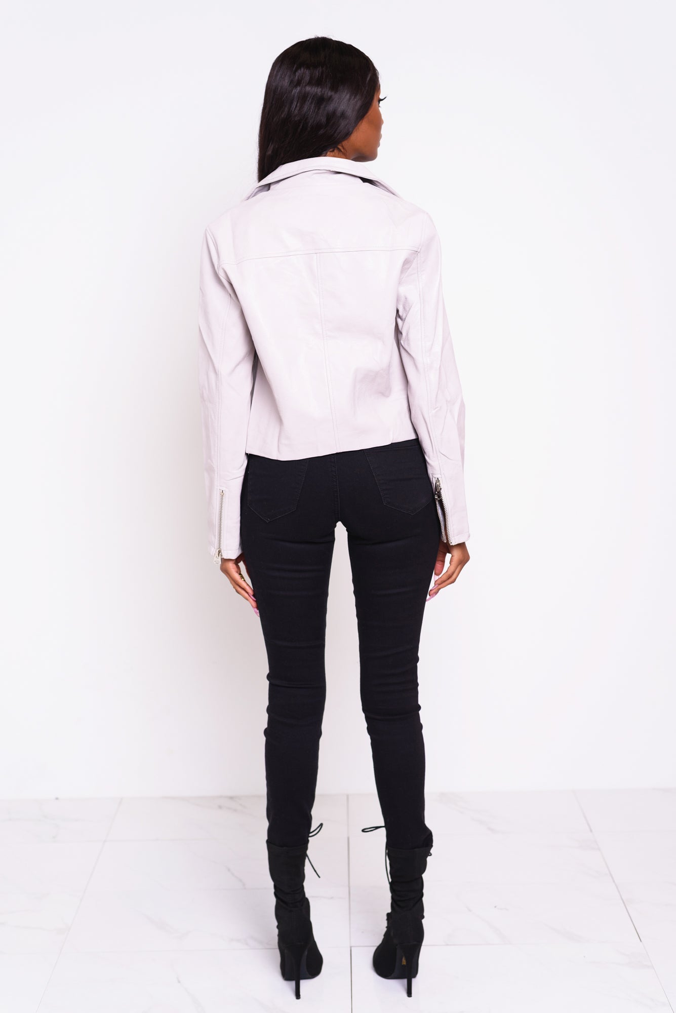 Grey leather moto jacket with front side and sleeve zippers. Model is wearing a size Small. 55% PU 45% Polyester.