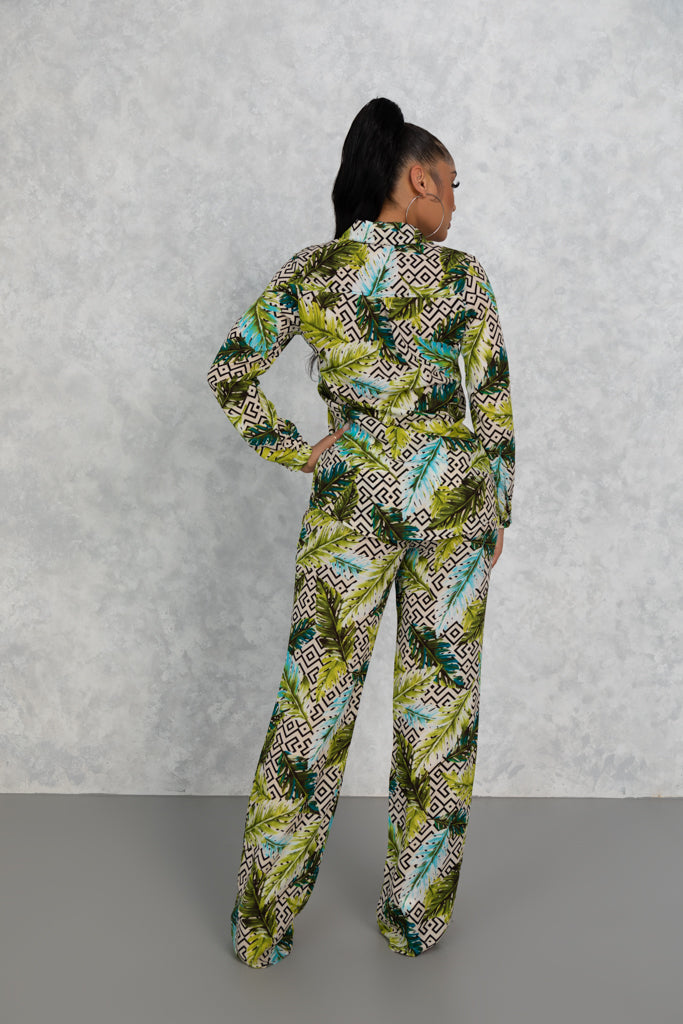 Our Las Palmas top makes you feel very airy and fresh all while looking luxurious. It features a black abstract pattern with green and turquoise palm leaves. This top pairs beautifully with the Las Palmas Trousers. Also available in mustard