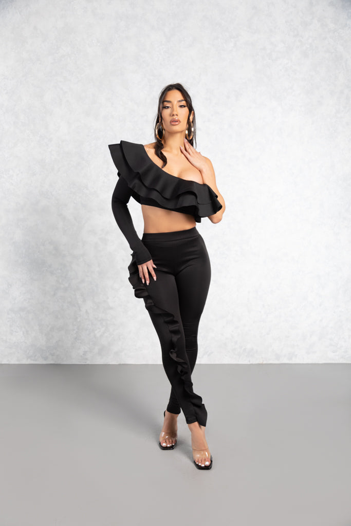 One sleeve cropped top with a layered ruffle detail all throughout. Model is wearing a small.