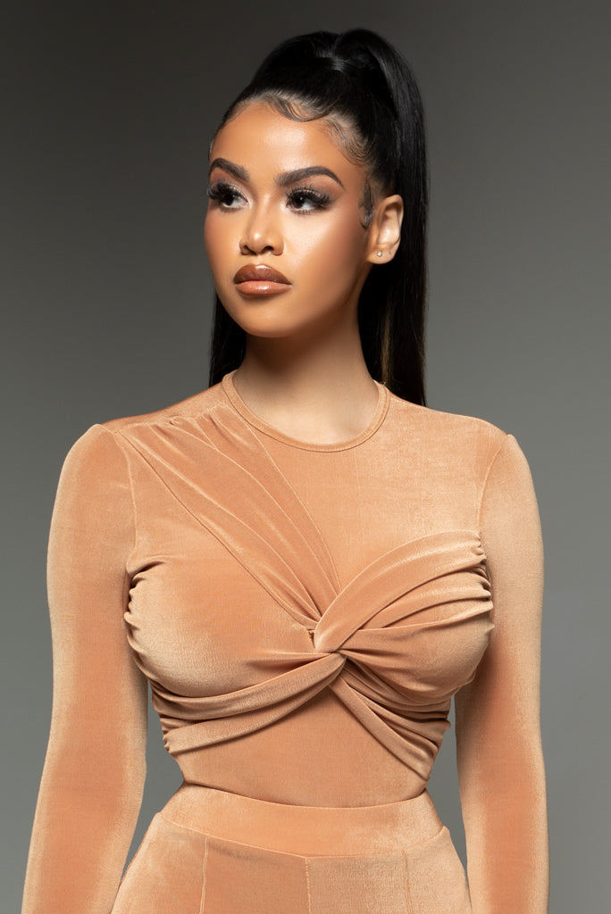 Our Twisted Camel Bodysuit is calling your name. Featuring long sleeves, a scoop neck line, and a twisted front, this is a necessary buy! It gives off a stylish elegance like no other!